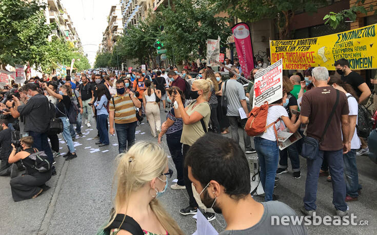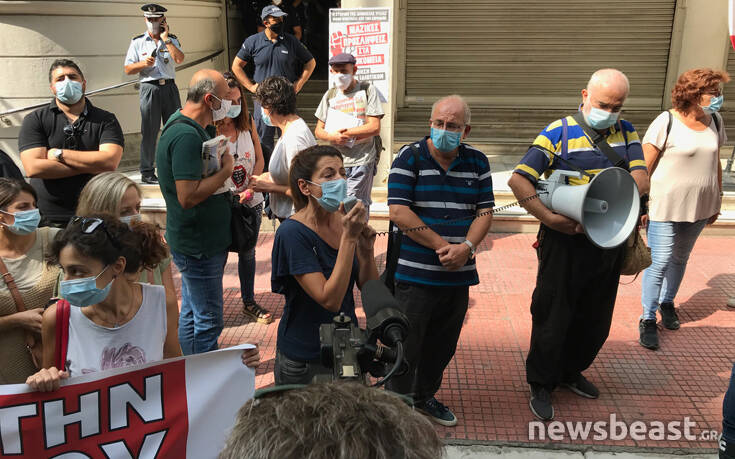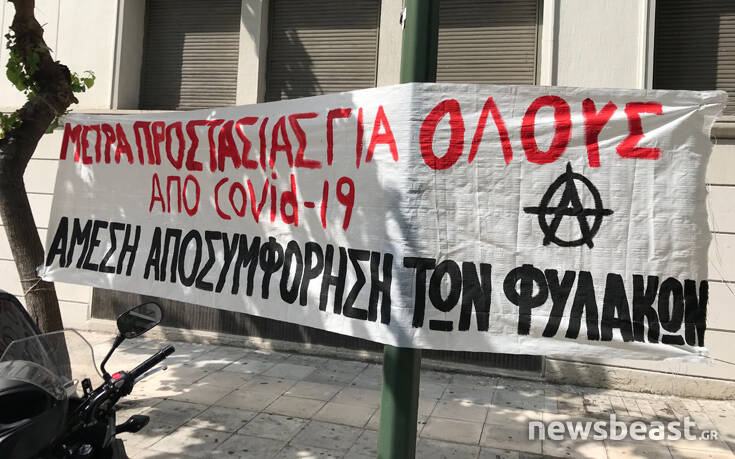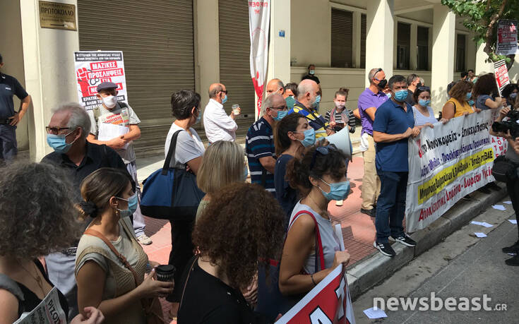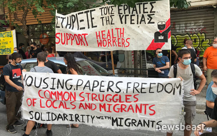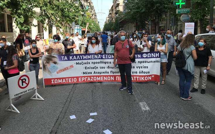 «Κάτω από τη μάσκα έχουμε φωνή, δωρεάν υγεία για κάθε ασθενή» γράφει ένα από τα πανό