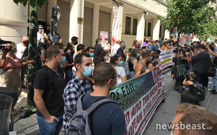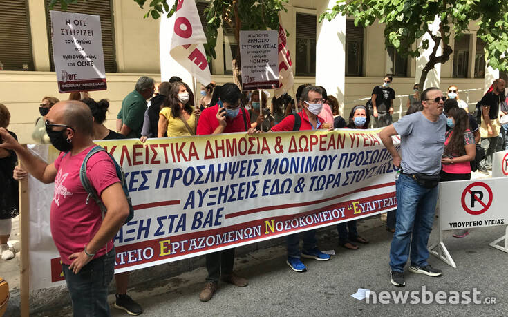 Έξω από το υπουργείο Υγείας διαδηλώνουν οι νοσοκομειακοί γιατροί στο πλαίσιο της 24ωρης πανελλαδικής απεργίας τους. «Κάτω από τη μάσκα έχουμε φωνή, δωρεάν υγεία για κάθε ασθενή» γράφει ένα από τα πανό.