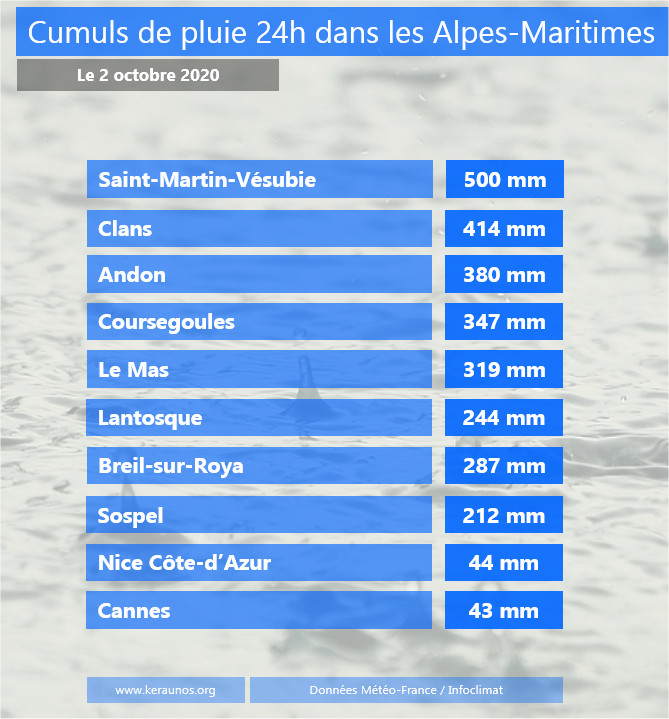 Ο πίνακας δείχνει τα μεγαλύτερα ημερήσια ύψη βροχής που καταγράφηκαν την Παρασκευή 2 Οκτωβρίου 2020 και από τις τιμές του γίνεται εύκολα αντιληπτή η επιρροή της έντονης ορογραφίας των Άλπεων: σε ορεινές περιοχές καταγράφηκαν έως και 500 mm ημερησίως που αντιστοιχούν σε φυσιολογικά ύψη βροχής 4-5 μηνών, ενώ στα παραθαλάσσια οι βροχοπτώσεις ήταν πολύ πιο ασθενείς (πχ. Νίκαια, Κάννες < 45 mm).