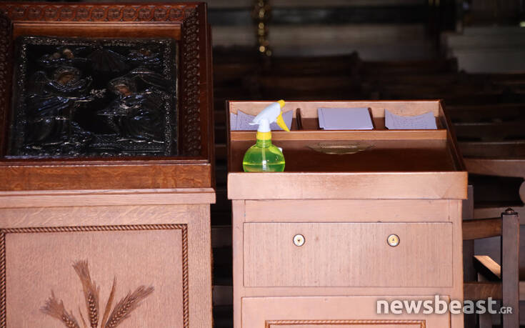 Όλες οι εκκλησίες στην είσοδό τους διαθέτουν πλέον αντισηπτικά ενώ όσοι εισέρχονται σε αυτές οφείλουν να φορούν μάσκα.