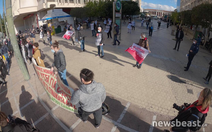 «Απεργούμε για τις ζωές και τις δουλειές μας» γράφει ένα από τα πανό, ενώ το Εργατουπαλληλικό Κέντρο της Αθήνας διαδηλώνει έξω από το υπουργείο Εργασίας.