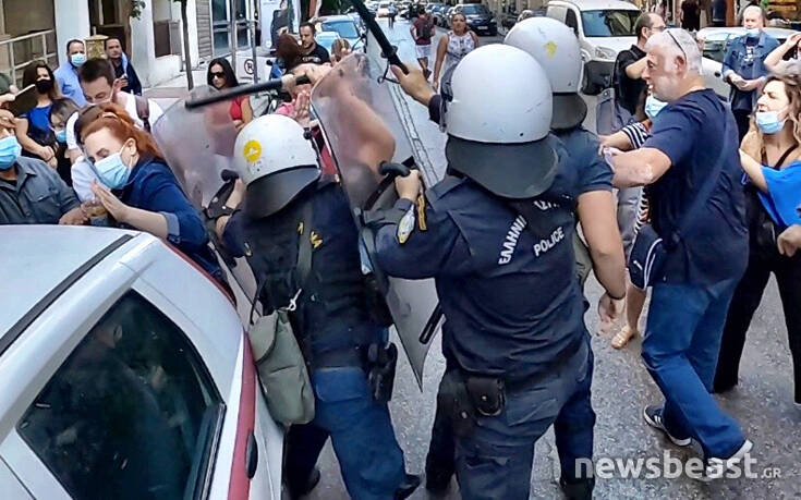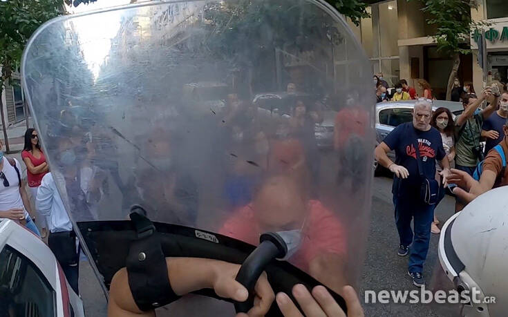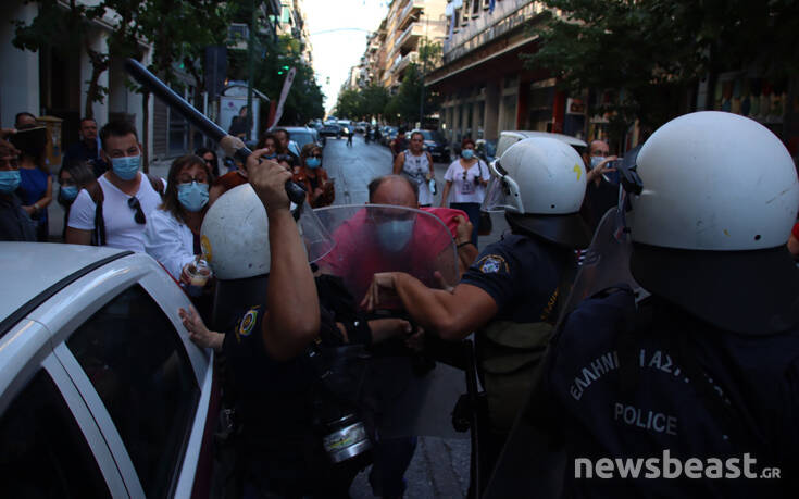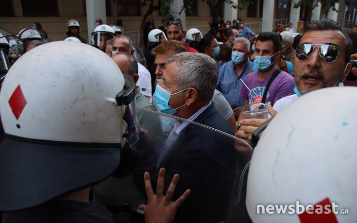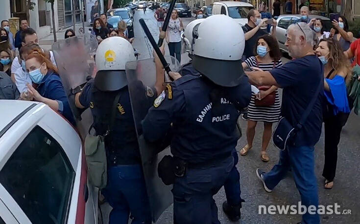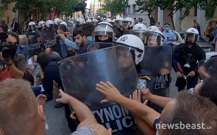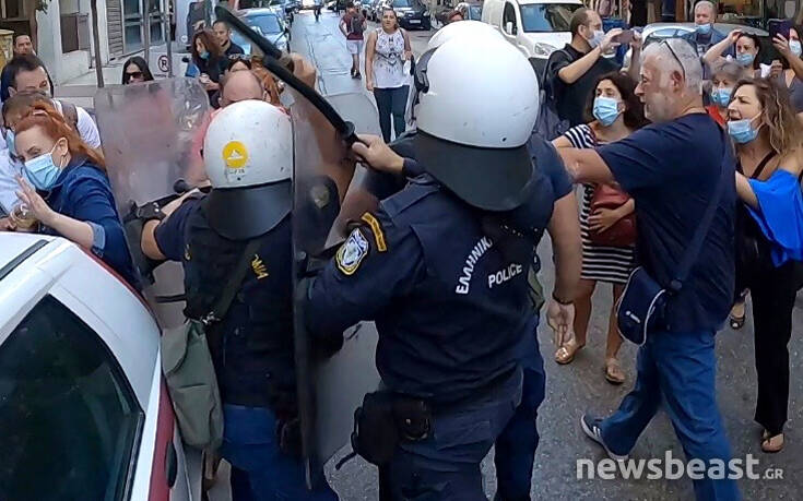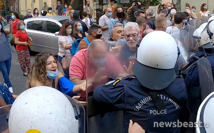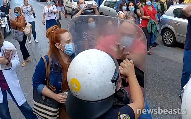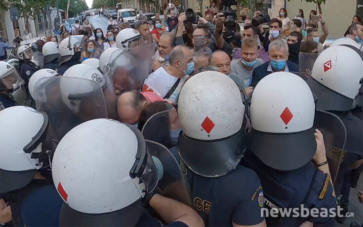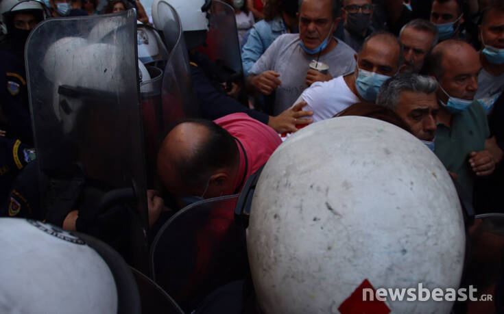 Τότε τα αίματα «άναψαν», οι διαδηλωτές -συμβασιούχοι γιατροί και νοσηλευτές και εργαζόμενοι στα νοσοκομεία- αντέδρασαν και ακολούθησε βίαιη απώθησή τους προς το πεζοδρόμιο, ακόμη και με τη χρήση γκλομπ. Επίσης, ο πρόεδρος της Ομοσπονδίας, Μιχάλης Γιαννάκος, βρέθηκε στο έδαφος, την ώρα που όλο αυτό το σκηνικό εκτυλισσόταν.