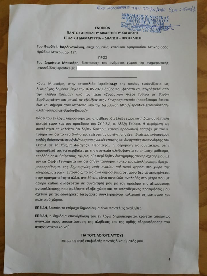 Με την εξώδικη δήλωση ο κ. Βαρδινογιάνης διαψεύδει κατηγορηματικά δημοσίευμα των δύο ιστοσελίδων για δήθεν συνάντησή του με τον πρόεδρο του ΣΥΡΙΖΑ, Αλέξη Τσίπρα και καλεί τον κ. Μπεκιάρη να αποσύρει το συγκεκριμένο άρθρο.