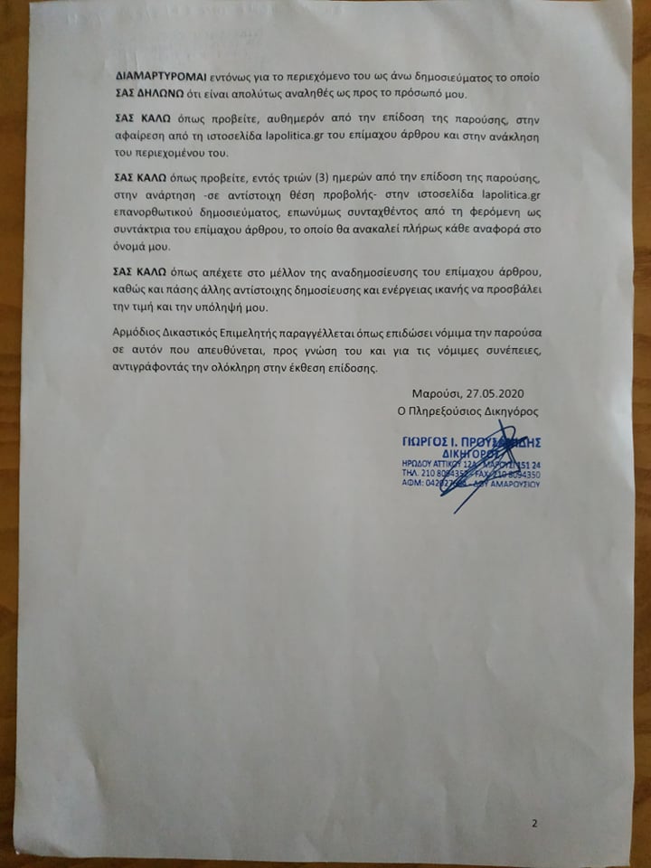 Στο εξώδικό του ο επιχειρηματίας αναφέρει ότι το περιεχόμενο του δημοσιεύματος είναι παντελώς αναληθές.