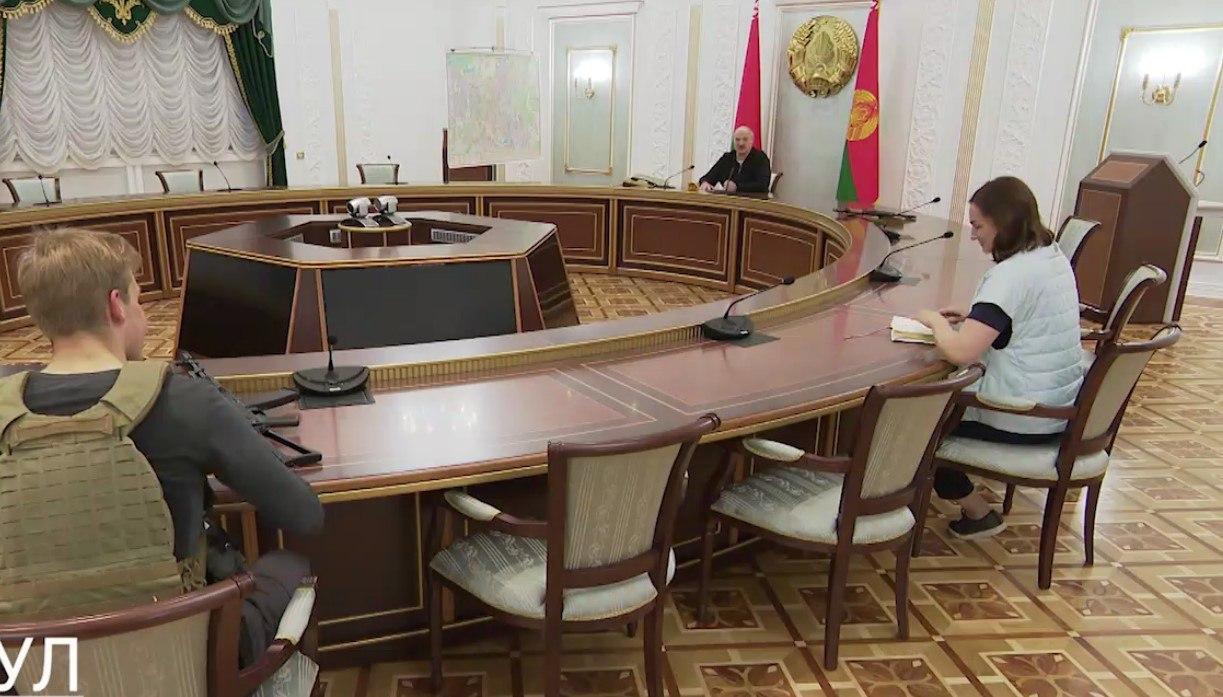 Σε μια άλλη εικόνα από το «δωμάτιο πολέμου» του Λευκορώσου προέδρου, διακρίνονται, εκτός από τον Λουκασένκο, η εκπρόσωπος Τύπου και ο γιος του με αλεξίσφαιρο και καλάσνικοφ επάνω στο τραπέζι!