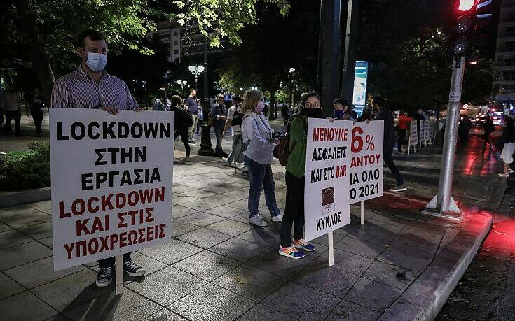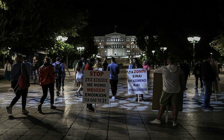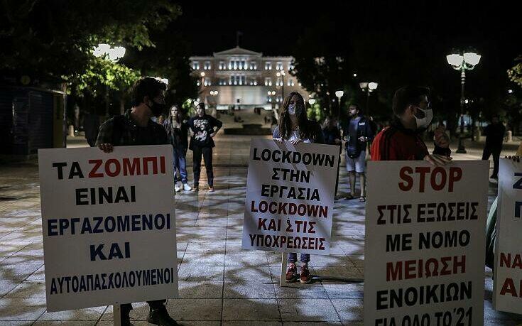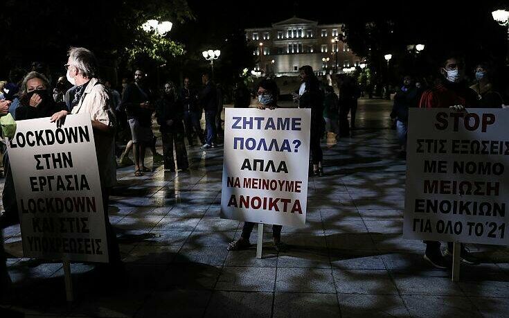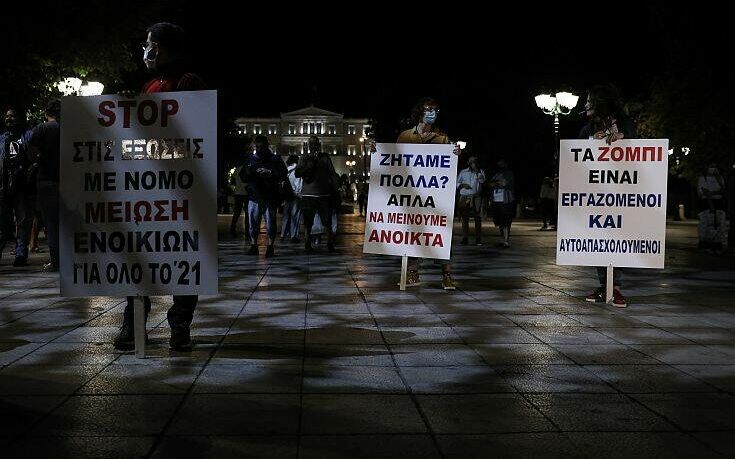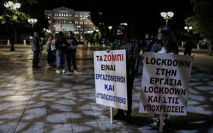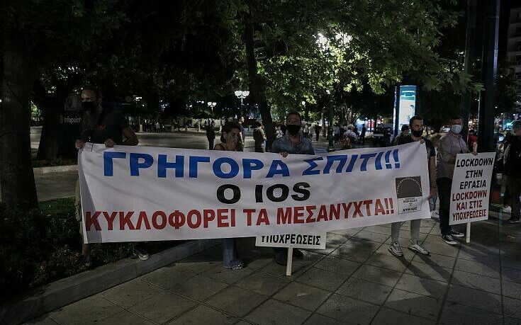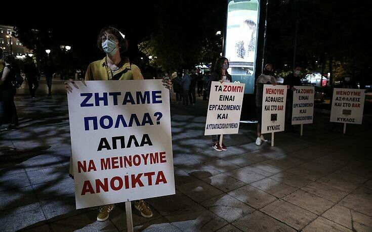 Συγκέντρωση διαμαρτυρίας πραγματοποίησαν τα μεσάνυχτα αμέσως το κλείσιμο των καταστημάτων τους οι επαγγελματίες στην πλατεία Συντάγματος.