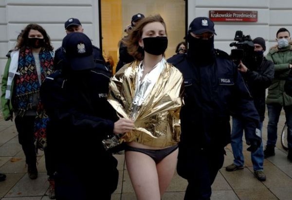 Δύο διαδηλωτές έβγαλαν σήμερα τα ρούχα τους μπροστά από το προεδρικό μέγαρο της Πολωνίας, έχοντας ζωγραφίσει στο γυμνό κορμί τους βρισιές, με τις κινητοποιήσεις, που έχουν συνταράξει την Πολωνία μετά την απόφαση δικαστηρίου να απαγορεύσει τις περισσότερες περιπτώσεις αμβλώσεων, να παίρνουν νέα μορφή.