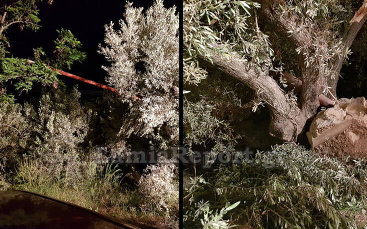 Από τη σύγκρουση το αυτοκίνητο έφυγε δεξιά, γκρεμίζοντας μια κολόνα φωτισμού και στη συνέχεια χτυπώντας σε μια ελιά ακινητοποιήθηκε εντός του οδοστρώματος.