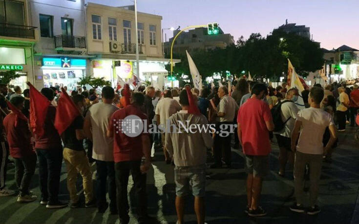 Οι συγκεντρωμένοι που κρατούσαν πλακάτ ζήτησαν το κλείσιμο των ξένων βάσεων στη Σούδα και την απεμπλοκή της Ελλάδας από κάθε στρατιωτικό σύμφωνο.