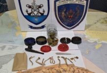 Πάνω του βρήκαν 36,5 γραμμάρια κοκαΐνης και 325,4 γραμμάρια ακατέργαστης κάνναβης τα οποία σκόπευε να διαθέσει προς πώληση, ενώ και κατά την έρευνα που ακολούθησε στην κατοικία του σε περιοχή της Ηλείας, οι αστυνομικοί κατέσχεσαν 141,8 γραμμάρια άγνωστης χημικής ουσίας για τη νόθευση της κοκαΐνης που εστάλη για ανάλυση, ένα κυνηγετικό όπλο το οποίο κατείχε παράνομα και ένα μαχαίρι τύπου “πεταλούδα”.