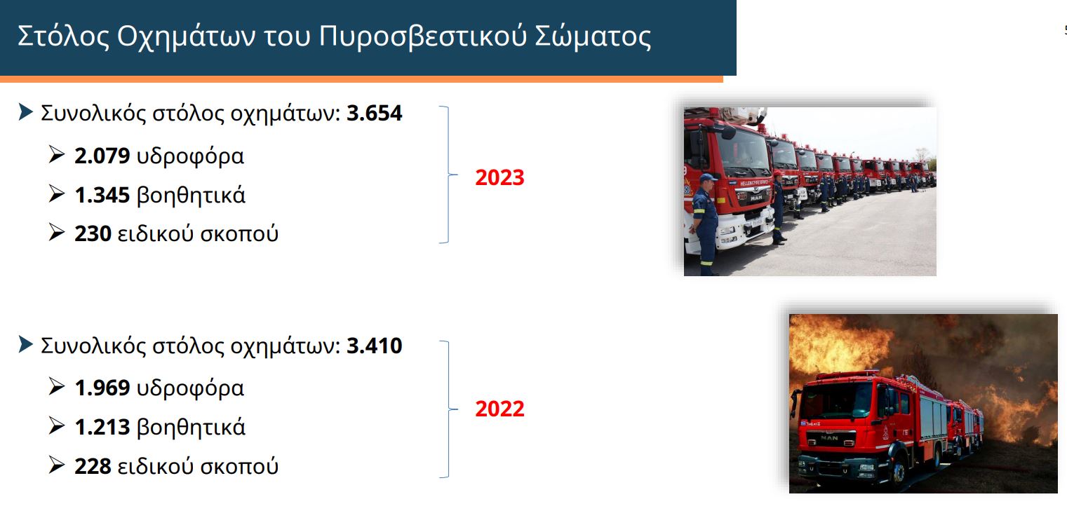 Το Πυροσβεστικό Σώμα διαθέτει φέτος συνολικά 3.654 οχήματα, εκ των οποίων τα 2.079 είναι υδροφόρα, τα 1.345 είναι βοηθητικά και τα 230 ειδικού σκοπού.