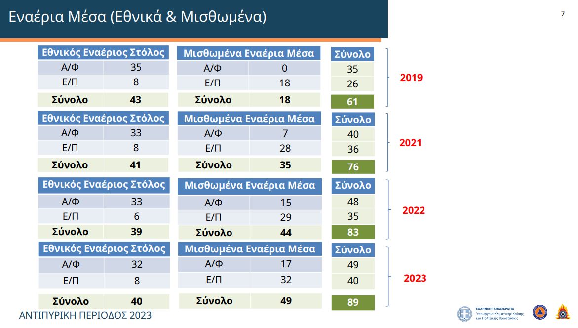 Σε ό,τι αφορά στα εναέρια μέσα, φέτος θα είναι διαθέσιμα 89 αεροσκάφη και ελικόπτερα. Τα 40 ανήκουν στον εθνικό εναέριο στόλο και τα 49 είναι μισθωμένα.