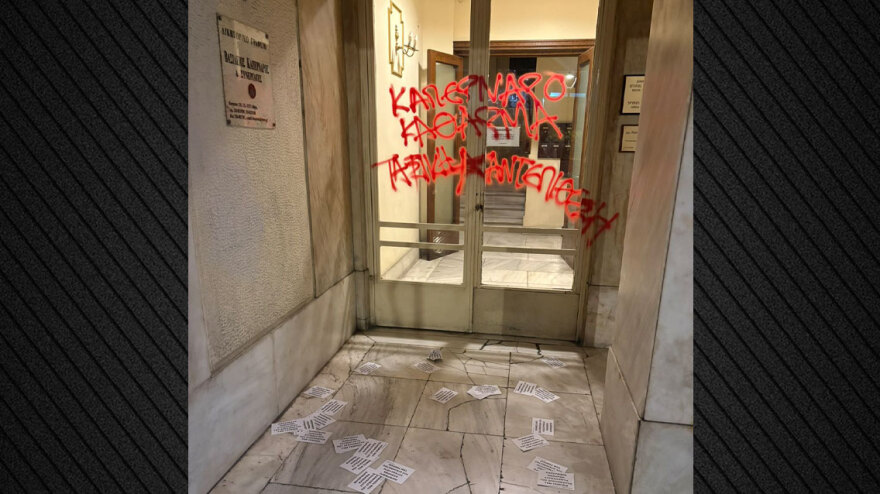 Σύμφωνα με πληροφορίες, οι άγνωστοι έγραψαν με κόκκινη μπογιά ένα σύνθημα στην πολυκατοικία όπου στεγάζεται το γραφείο του δικηγόρου, πέταξαν τρικάκια και αποχώρησαν.