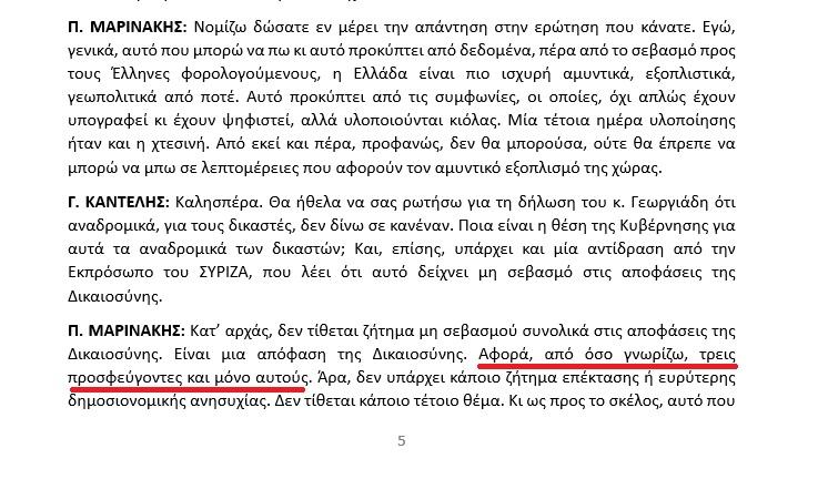 «Είναι μία απόφαση της δικαιοσύνης, απ’ όσο γνωρίζω αφορά δύο προσφεύγοντες, και μόνο αυτούς» είπε ο Παύλος Μαρινάκης. Ωστόσο, αφορούσε τρεις, με αποτέλεσμα από το Μαξίμου να βάλουν «χέρι» στις δηλώσεις του ίδιου του κυβερνητικού εκπροσώπου, διορθώνοντάς τον.