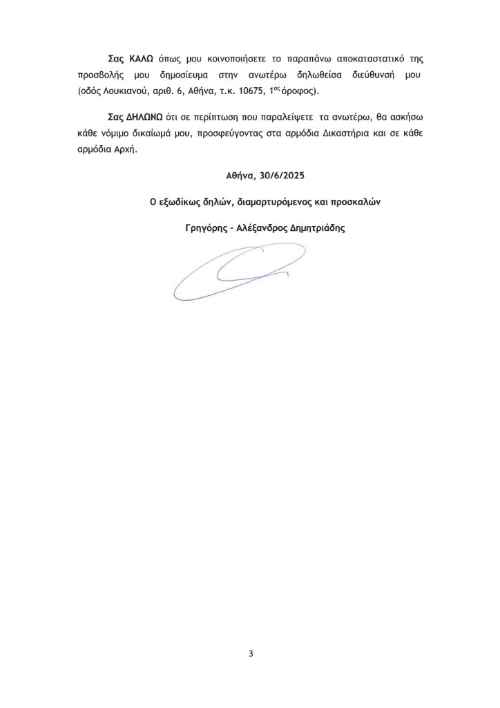 Μετά την εξώδικη διαμαρτυρία του κ Δημητριάδη Γρηγόρη, για την αναδημοσίευση άρθρου της 20ης Ιουνίου 2025 της ιστοσελίδας in.gr, όπως αναλυτικώς εκτίθεται στην πιο κάτω εξώδική του, την οποία και δημοσιεύουμε ολόκληρη, του ζητούμε συγνώμη για την αναπαραγωγή εξυβριστικών για το πρόσωπό του εκφράσεων – “σκατά μαζεμένα” “dream team της πολιτικής δυσωδίας”, τις οποίες και ανακαλούμε, με την ταυτόχρονη διαγραφή του από 20 Ιουνίου 2025 δημοσιεύματος της ιστοσελίδας in.gr.