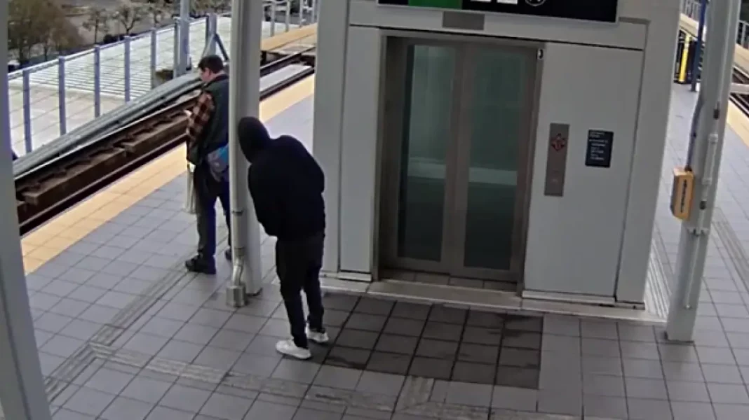 Κάμερα παρακολούθησης κατέγραψε τις τρομακτικές στιγμές που έζησε ένας επιβάτης το σιδηροδρομικό σταθμό Northgate στο Σιάτλ, όταν άνδρας τον έσπρωξε για να πέσει στις ράγες όταν έφτασε ο συρμός.