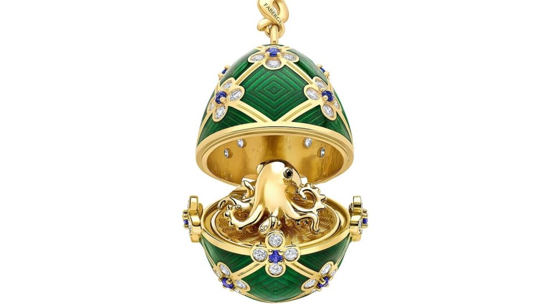 Το φερόμενο ως κλεμμένο αυγό Fabergé είναι διακοσμημένο με 60 λευκά διαμάντια και 15 μπλε ζαφείρια, σύμφωνα με την ιστοσελίδα του κοσμηματοπώλη, και ανοίγει αποκαλύπτοντας ένα μικροσκοπικό χταπόδι από χρυσό 18 καρατίων.