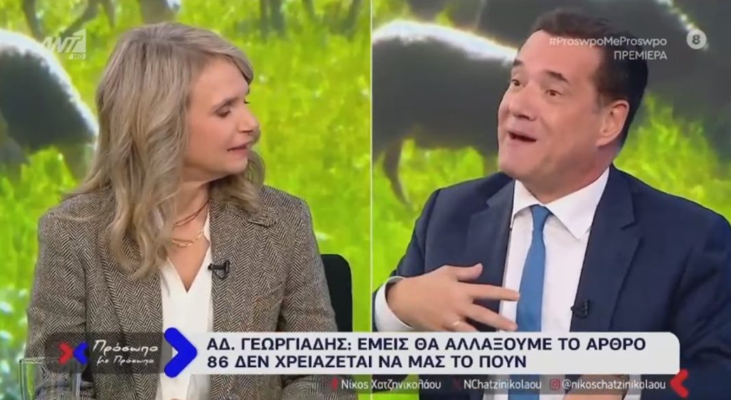 Απαντώντας στην τοποθέτηση της Μιλένας Αποστολάκη για το πρόσωπό του, ο Άδωνις Γεωργιάδης είπε τα εξής: «Θέλω να παρακαλέσω την κυρία Αποστολάκη να μην μου ξανακάνει υφολογική παρατήρηση γιατί με προσβάλλει. Εγώ δεν προσέβαλα την κυρία Αποστολάκη. Ούτε αν μου αρέσει το ύφος της, ούτε αν το βρίσκω βαρετό, ούτε αν το βρίσκω οξύ… τίποτα. Ο καθένας το ύφος του… Μας κρίνουν οι τηλεθεατές κι οι ψηφοφόροι μας. Εμένα δόξω τω Θεώ με εκλέγουν 18 χρόνια, άρα σε κάποιους αρέσω με αυτό το ύφος. Θα σας παρακαλέσω για λόογυς υφολογικούς να μην μου ξανακάνετε παρατήρηση».