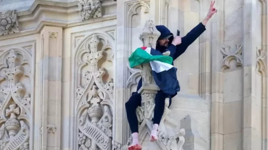 Ο άνδρας ανέβηκε στον Πύργο της Ελισάβετ στο Παλάτι του Γουεστμίνστερ κρατώντας μια παλαιστινιακή σημαία το πρωί του Σαββάτου.