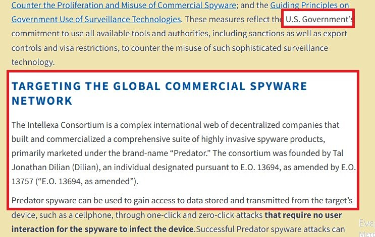 Σημειώνεται ότι σε αυτές τις ανακοινώσεις των κυβερνητικών υπηρεσιών των ΗΠΑ σημειωνόταν «η Κοινοπραξία Intellexa είναι ένας διεθνής ιστός αποκεντρωμένων εταιρειών που κατασκεύασαν και προώθησαν εμπορικά μια σειρά προϊόντων spyware, κυρίως με την επωνυμία Predator […] Στους παλαιότερους στόχους των προϊόντων spyware της Intellexa Consortium συμπεριλαμβάνονται κυβερνητικοί αξιωματούχοι, δημοσιογράφοι, ειδικοί σε θέματα πολιτικής και πολιτικοί της αντιπολίτευσης».
