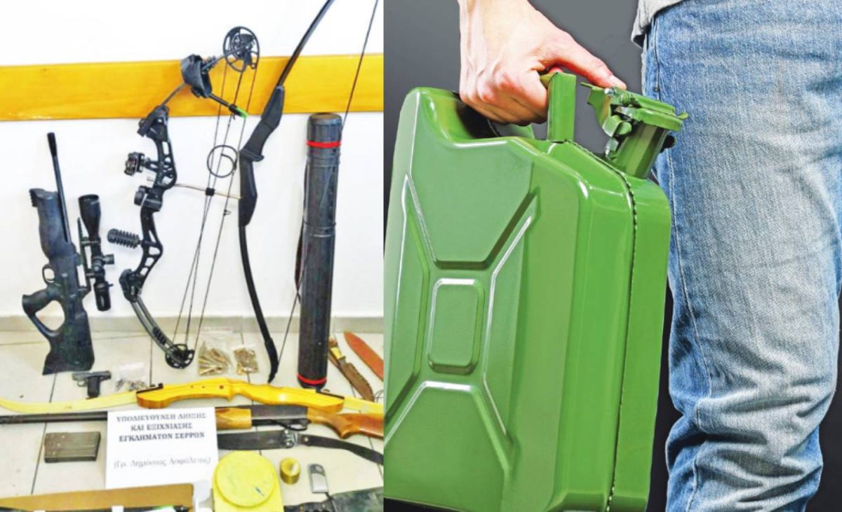 Σύμφωνα με την Αστυνομία, κατά την έρευνα στην οικία του 55χρονου βρέθηκαν και κατασχέθηκαν ένα πλαστικό μπιτόνι που περιείχε ποσότητα εύφλεκτου υγρού, μία κυνηγετική καραμπίνα, ένα αεροβόλο όπλο με σκοπευτική διόπτρα, δύο τόξα και μία φαρέτρα με 10 βέλη, ακατέργαστη κάνναβη βάρους 23 γραμμαρίων, ένα πιστόλι κρότου, μία γεμιστήρα και 74 φυσίγγια διαφόρων διαμετρημάτων, ένα ξύλινο τόξο και διάφορα βέλη, δύο ηλεκτρονικές ζυγαριές και ένας μεταλλικός τρίφτης κάνναβης.