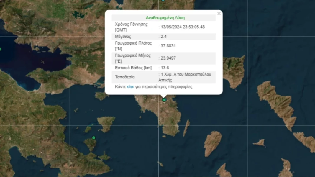 Ασθενής σεισμική δόνηση μεγέθους 2,4 βαθμών της Κλίμακας Ρίχτερ σημειώθηκε στις 02:53 τα ξημερώματα της Τρίτης (14/5) στην Αττική.