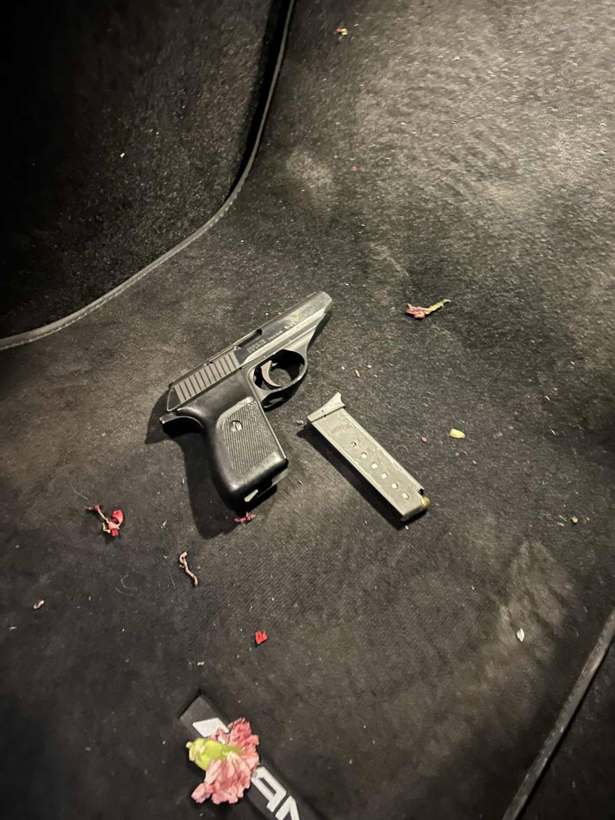 Κατά της διάρκεια του ελέγχου βρέθηκε κάτω από το κάθισμα του συνοδηγού ένα πιστόλι με έξι φυσίγγια στην γεμιστήρα. Εκεί μάλιστα υπήρχε και ένα γαρύφαλλο.