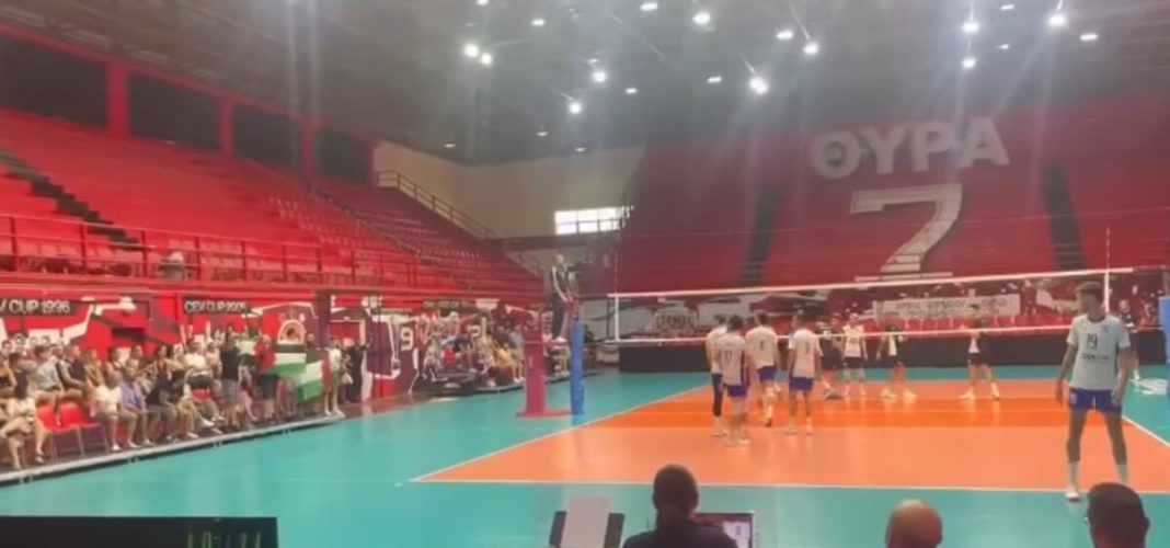 Σε παρέμβαση με σημαίες της Παλαιστίνης προχώρησαν στο φιλικό παιχνίδι των εθνικών ομάδων βόλεϊ της Ελλάδας με το Ισραήλ στο «Μελίνα Μερκούρη» του Ρέντη, μέλη του March to Gaza Greece.