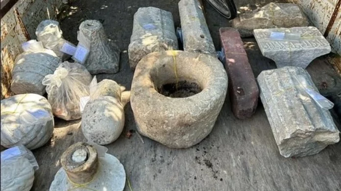 Στην έρευνα στο σπίτι βρέθηκαν 42 τμήματα αρχαίων αντικειμένων, δέκα από τα οποία αποτελούσαν μέρος της τοιχοποιίας