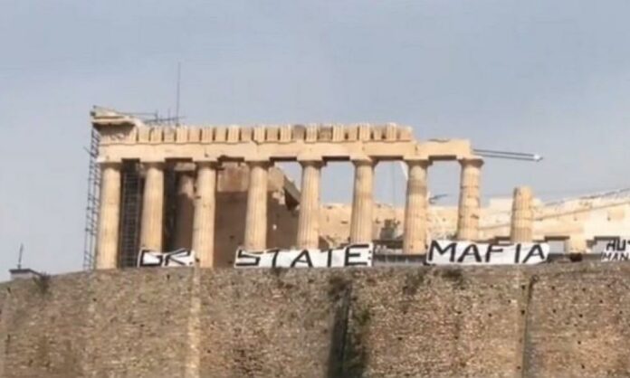 GR STATE MAFIA TRAFFICKING έλεγε το πανό που ανάρτησαν - Τέσσερις προσαγωγές