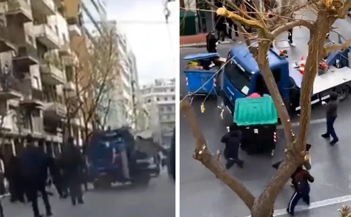 Βίντεο με τον γερανό της αστυνομίας να κάνει ελιγμούς στην Ακαδημίας – Παρέσυρε κάδους που έβαλαν στον δρόμο του διαδηλωτές