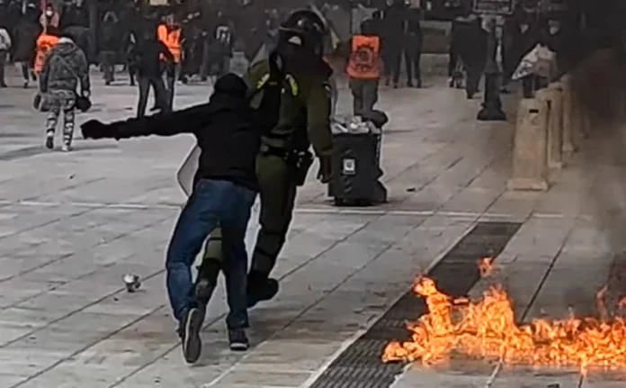 Διαδηλωτής κυνηγάει άνδρα των ΜΑΤ μέσα στις φλόγες και τον χτυπάει με το κράνος – (VIDEO)