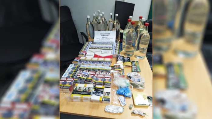 Οι αστυνομικοί κατέσχεσαν 14 φιάλες με συνολικά 28 λίτρα αλκοολούχων ποτών, καθώς επίσης 144 πακέτα τσιγάρων και τρεις συσκευασίες με καπνό