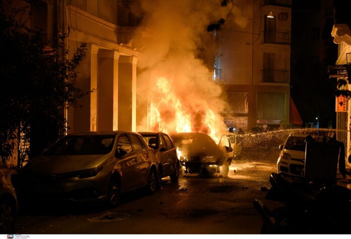 Πυρπόλησαν με μολότοφ γερανό από τα έργα στην Πανεπιστημίου - Συμπλοκή και στον Λευκό Πύργο στη Θεσσαλονίκη