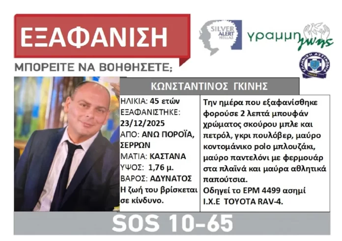 Συναγερμός έχει σημάνει για την εξαφάνιση ενός 45χρονου από τα Άνω Πορόια Σερρών. Πριν από λίγο η Γραμμή Ζωής εξέδωσε silver alert δημοσιοποιώντας τα...