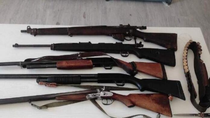 Οι αστυνομικοί βρήκαν και κατάσχεσαν δυο πολεμικά τυφέκια με έναν γεμιστήρα, τρία κυνηγετικά όπλα χωρίς άδειες κατοχής, 20 φυσίγγια και ένα μαχαίρι