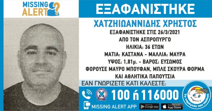 Συναγερμός σήμανε στον Ασπρόπυργο για την εξαφάνιση του 36χρονου Χατζηιωαννίδη Χρήστου, στις 26 Μαρτίου 2021, στις 10:00.