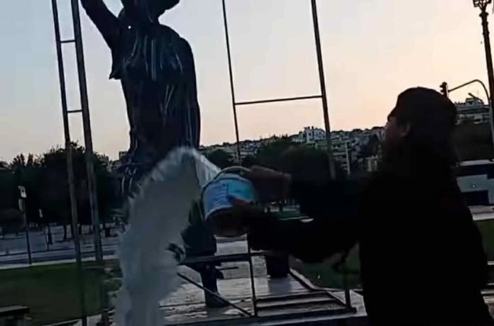 Απίστευτο περιστατικό στη Θεσσαλονίκη: Ρασοφόρος έφτυσε και πέταξε μπογιές στο γλυπτό “Γυναίκα σε λεωφορείο” στην Αριστοτέλους (φωτο)