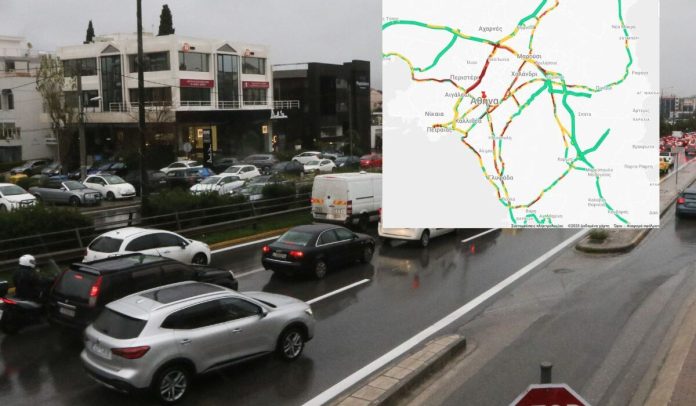 Δεν κουνιέται τίποτα: Απίστευτη κίνηση σε όλη την Αθήνα – Προβλήματα από τη βροχή και το χαλάζι