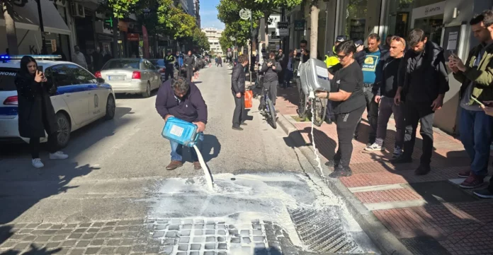 Λάρισα: Οργισμένοι κτηνοτρόφοι έριξαν γάλα έξω από το πολιτικό γραφείο του Κέλλα – (VIDEO)