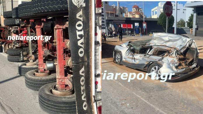 Βάρη: Νταλίκα ανατράπηκε και «έλιωσε» αυτοκίνητο έξω από βενζινάδικο (ΦΩΤΟ-VIDEO)