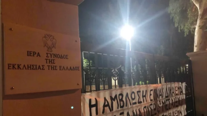 Πανό στην είσοδο του κτηρίου της Ιεράς Συνόδου στην Κηφισιά με το οποίο...
