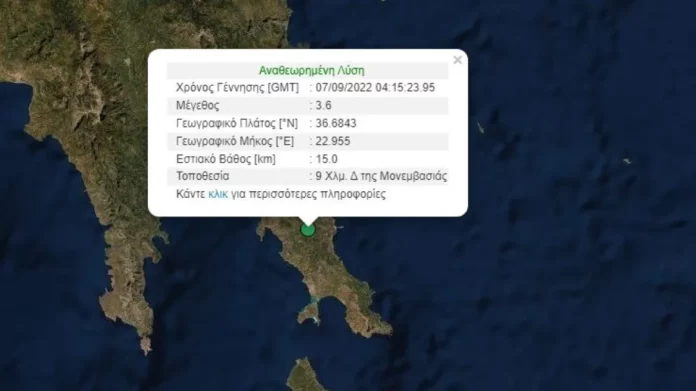 Ο σεισμός στη Μονεμβασιά σημειώθηκε στις 7:15 το πρωί της Τετάρτης (7/9)