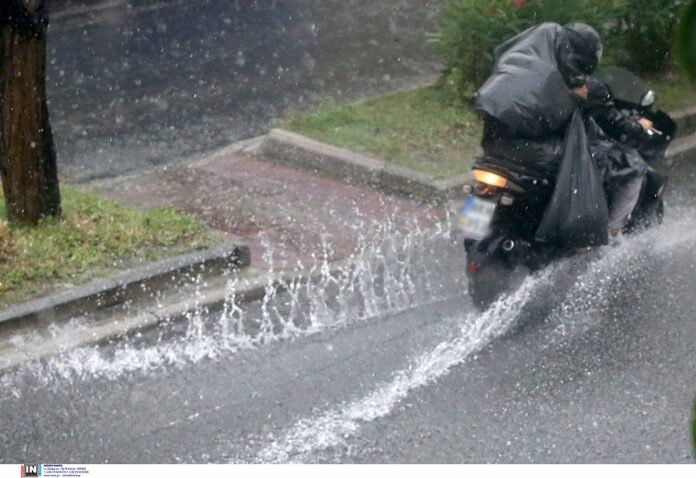 Έντονη βροχόπτωση προκαλεί προβλήματα σε οδηγούς και καταστηματάρχες.