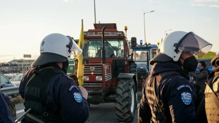 Με αναμμένες τις μηχανές τα τρακτέρ των αγροτών στη Νίκαια της Λάρισας - Ισχυρές αστυνομικές δυνάμεις έχουν αποκλείσει την είσοδό τους στην εθνική οδό.