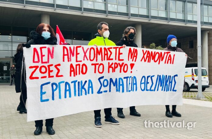 Εκπρόσωποι εργατικών σωματείων και μέλη του ΠΑΜΕ πραγματοποίησαν παράσταση διαμαρτυρίας στο δημαρχείο Θεσσαλονίκης με αφορμή τον πρόσφατο θάνατο αστέγου από το ψύχος.