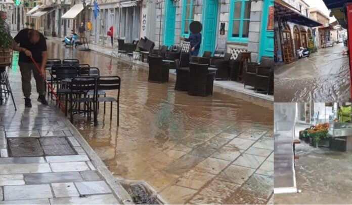 Η βροχή που έπεσε στη Σύρο προκάλεσε πολλά προβλήματα στην Ερμούπολη με καταστήματα και φρεάτια να πλημμυρίζουν