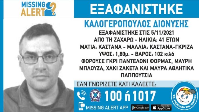 Στις 05/11/2021 και ώρα 08:30, εξαφανίστηκε από την περιοχή της Ζαχάρως, ο Διονύσης Καλογερόπουλος, 41 ετών.