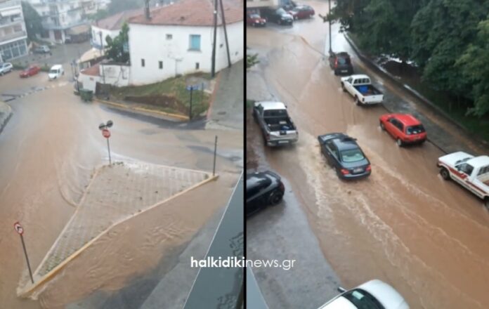 Σε ποτάμια μετατράπηκαν οι δρόμοι στον Πολύγυρο από την έντονη βροχόπτωση.