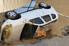 Αυτοκίνητο «βούλιαξε» και επέπλεε στις λάσπες στο Ηράκλειο όταν οδόστρωμα υποχώρησε λόγω της κακοκαιρίας
